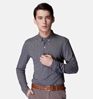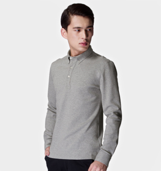 浅花灰色领尖扣款纯棉长袖POLO衫