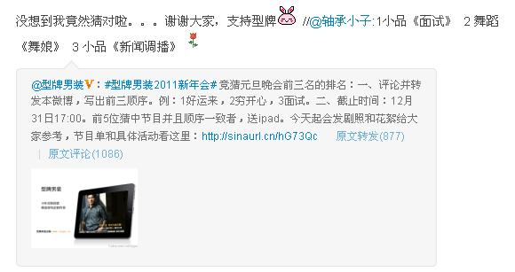 新浪微博网友@轴承小子 发来信息,说猜中了我们元旦晚会获奖节目前三的正确排名,现在我就把截图发出来,公示给网友。