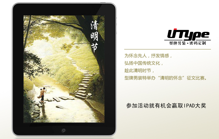 为怀念先人,抒发情感,弘扬中国传统文化,清明时节,型牌男装特举办“清明的怀念”征文比赛,凡转发此微博,并用@微博帐户的方式推荐三个人(如@型牌男装@酷绅职业装@黄岳南),即可投稿参与比赛。前三名获奖作品作者将分别获得ipad、型牌精品领带套装、型牌浪漫法式袖扣等奖品,获奖作品的第一个推荐人将获得500元现金奖励,获奖作品前4—20名及其第一推荐人还将获赠价值300元左右的型牌领带一条。