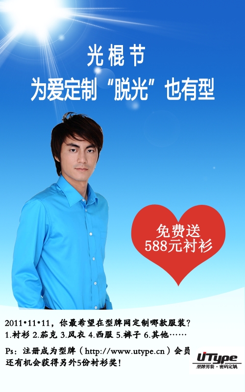二、即日起至11月13日,型牌网(http://www.utype.cn)新注册会员,第88位,388位,588位,788位,988位成为幸运会员,送588元高级定制衬衫!共计派送5件衬衫!(注册时:请备注“脱光”也有型)