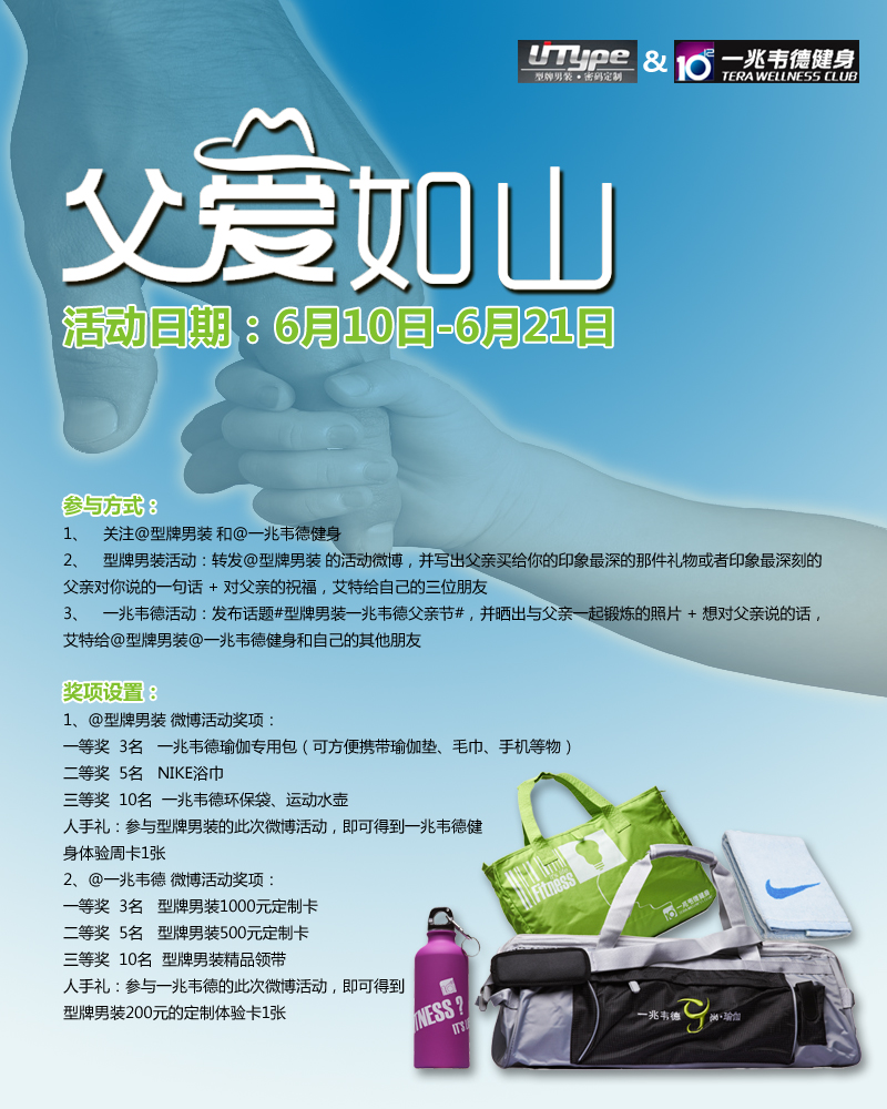 2、 型牌男装活动:转发@型牌男装 的活动微博,并写出父亲买给你的印象最深的那件礼物或者印象最深刻的父亲对你说的一句话 + 对父亲的祝福,艾特给自己的三位朋友