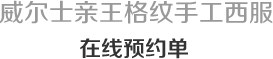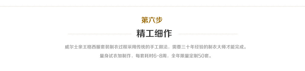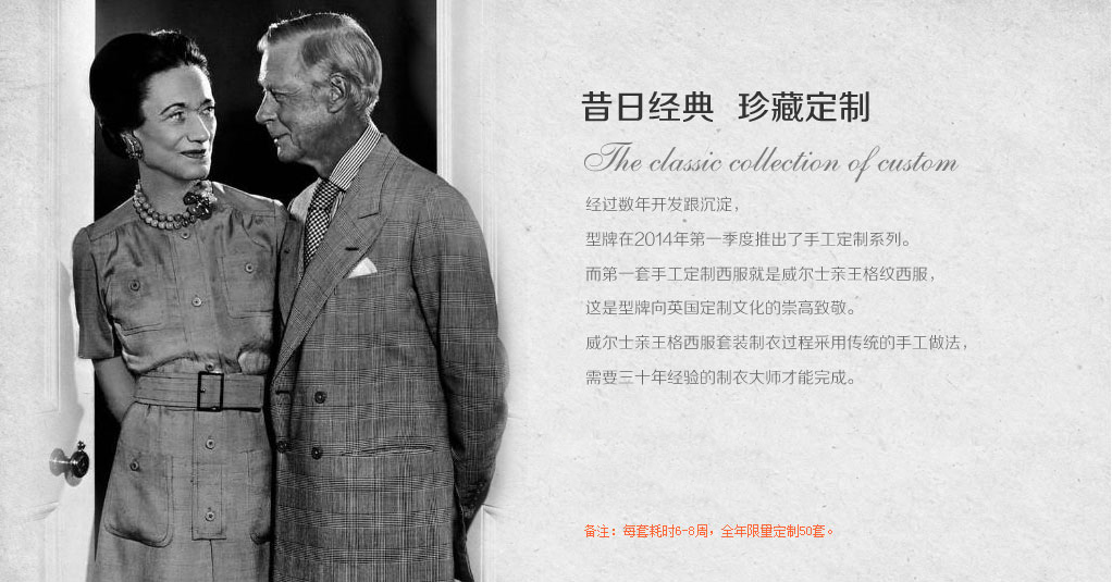 威尔士亲王格西服套装制衣过程采用传统的手工做法,需要三十年经验的制衣大师才能完成。量身试衣加制作,每套耗时6-8周,全年限量定制50套。为了更好的为您提供个性定制服务,请认真填写如下信息: